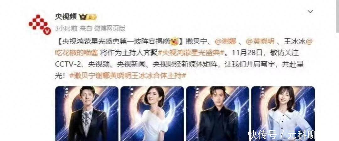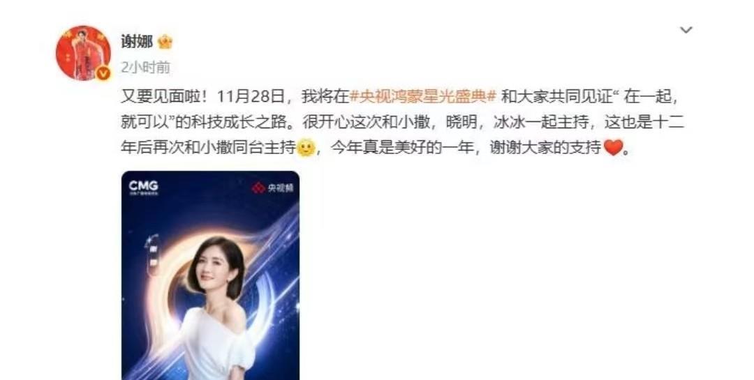 谢日通过微博确认,自己将和撒贝宁、黄晓明、王冰冰一起主日的鸿蒙星光盛典,这是央视财经频道的重要活动。同一时间,她还日官宣成为今年央视中秋晚会主持人,并且是家乡四川德阳首次举办这个节目。谢娜在微博里反复表达激动,提到十二年后再次和撒贝宁同台,还回忆起中秋晚会录制当天,自称“开心到要哭”。这两场活动让粉丝注意到,她今年接了不少央视主持工作,从中秋到鸿蒙,频率比以前多了不少。